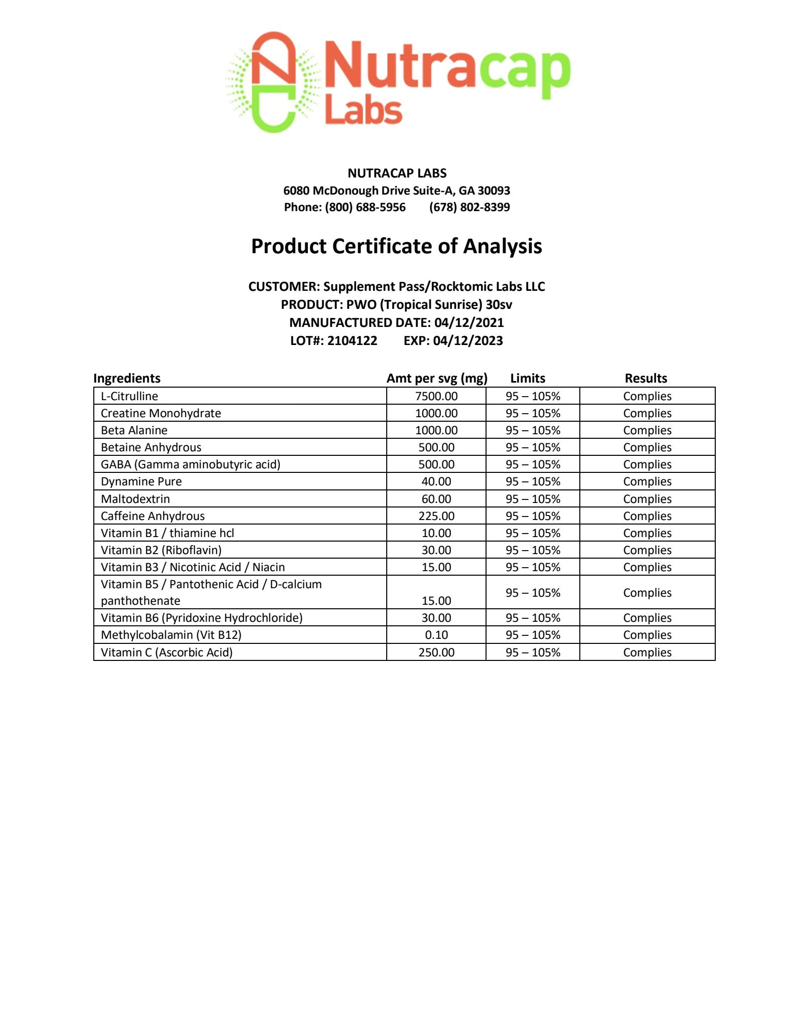 Pre-Workout tropical sunrise is synthesized to improve exercise performance, increase muscle protein synthesis, prevent muscle tissue breakdown, increase energy, increase cognition, enhance your pump, and take your workouts to the next level! Our product is synthesized utilizing the latest scientific research and formulated with optimal ratios of branch chain amino acids to produce world-class results. Our formula is third-party independently tested for heavy metals, impurities, made in the USA, GMP certified, and produced in an FDA registered facility. 1% of the supplements on the market can match our world class standards. |